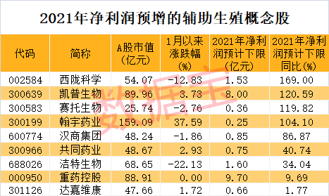 根据业绩快报和预告净利润下限计算,辅助生殖概念股中,2021年净利润预增的有9只,其中西陇科学、凯普生物、赛托生物、翰宇药业等4股净利润预计翻倍增长。西陇科学预增幅度最高,公司预计2021年净利润为1.53亿元至2亿元,同比增长169%至252%,主要原因是受市场供求关系等多种因素的影响,部分化工产品价格上涨,加上转让控股子公司福建福君基因生物科技有限公司部分股权,导致公司盈利出现大幅增长。