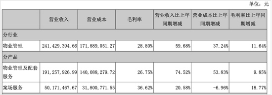 其中,物业管理划分为物业管理及配套服务、案场服务两个产品类型,收入分别为1.91亿元、5017.15万元,对应毛利率分别为 27%、37%,报告期内同比分别增长9%、19%。