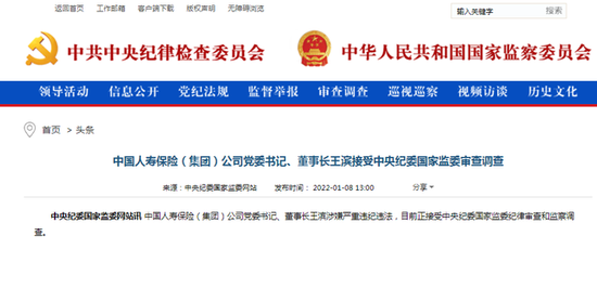 据中央纪委国家监委网站1月8日消息,中国人寿保险(集团)公司党委书记、董事长王滨涉嫌严重违纪违法,目前正接受中央纪委国家监委纪律审查和监察调查。