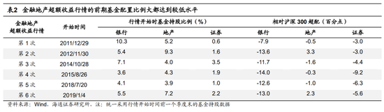 金融地产超额收益行情开始之初,基金配置比例通常处于低位。回顾历史,金融地产超额收益行情前期公募基金对金融地产板块的配置比例也处在低位,其中银行的低配幅度往往超过10个百分点,券商的低配幅度往往在5个百分点左右,地产也时常出现低配的情况。具体而言:第1次行情初期(11Q3)银行板块基金相对沪深300(下同)超低配比例为-7.9个百分点,地产为-0.5个百分点,证券为-3个百分点;第2次行情初期(12Q3)银行板块基金超低配比例为-13.6个百分点,地产为3.3个百分点,证券为-3个百分点;第3次行情初期(14Q3)银行板块基金超低配比例为-11.7个百分点,地产为-1.6个百分点,证券为-4.4个百分点;第4次行情初期(15Q2)银行板块基金超低配比例为-14个百分点,地产为-0.3个百分点,证券为-9.2个百分点;第5次行情初期(18Q2)银行板块基金超低配比例为-12.6个百分点,地产为-1个百分点,证券为-6.3个百分点;第6次行情初期(18Q4)银行板块基金超低配比例为-13.0个百分点,地产为2.3个百分点,证券为-5.6个百分点。