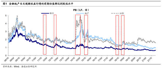历次超额收益行情期间金融地产的估值通常会得到一定程度的修复。回顾金融地产存在超额收益的6次行情,前期金融地产板块整体估值往往处于历史较低的水平,但经历一轮上涨之后,金融地产板块的估值大都会得到一定程度的修复。大致来看,前4次行情中,前期银行PB(LF,下同)往往回落至1.0倍左右(均值,下同),行情后期回升至1.3倍左右,修复幅度为26%;行情前期地产PB往往回落至1.9倍左右,行情后期回升至2.5倍左右,修复幅度为32%;行情前期证券往往回落至1.7倍左右,行情后期回升至2.8倍左右,修复幅度为71%。但随着金融地产估值中枢的下滑,第5和第6次行情期间金融地产板块整体估值较低,并且修复程度小于前4次行情。大致来看,后2次行情中,前期银行PB往往回落至0.8倍左右,行情后期回升至0.9倍左右,修复幅度为6%;行情前期地产PB往往回落至1.3倍左右,行情后期回升至1.5倍左右,修复幅度为16%;行情前期证券往往回落至1.2倍左右,行情后期回升至1.6倍左右,修复幅度为27%。
