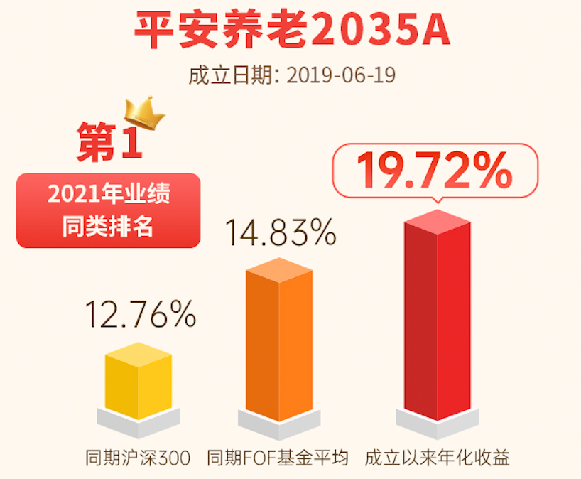 1、业绩数据来源:Wind,经托管行复核,截至2021年12月31日。平安养老目标日期2035三年持有期混合型基金中基金成立于2019年6月19日,业绩比较基准为中证平安2035退休宝指数收益率*95%+同期银行活期存款利率*5%,高莺自2019年6月20日起至今担任基金经理,张文君自2019年6月19日至今担任基金经理;2019、2020年、2021年初至今和成立至今,平安养老2035A净值及其比较基准增长率为:8.24%/6.90%、29.28%/11.50%、14.17%/8.13%、59.75%/30.35%。2、同类FOF平均及指数业绩数据来源Wind,截至2021年12月31日。3、同类排名数据来源:银河证券,同类为养老目标日期基金(2035)(A类),具体排名1/14,截至2021年12月31日。