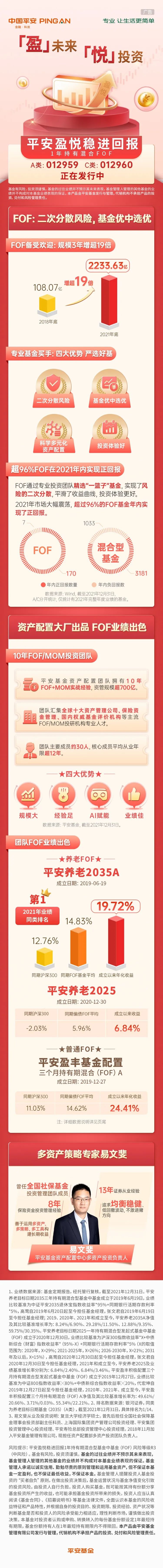 风险提示:平安盈悦稳进回报1年持有期混合型基金中基金(FOF)风险等级:中风险(R3)。基金有风险,投资须谨慎。基金的过往业绩并不预示其未来表现,基金管理人管理的其他基金的业绩并不构成对本基金业绩表现的保证。基金管理人承诺以诚实信用、勤勉尽责的原则管理和运用基金资产,但不保证本基金一定盈利,也不保证最低收益,不保证本金。基金管理人提醒投资人基金投资的“买者自负”原则,在做出投资决策后,基金运营状况与基金净值变化引致的投资风险,由投资人自行负担。投资人购买基金,既可能按其持有份额分享基金投资所产生的收益,也可能承担基金投资所带来的损失。投资人应当认真阅读《基金合同》、《招募说明书》等基金法律文件,全面认识本基金的风险收益特征和产品特性,并根据自身的投资目的、投资期限、投资经验、资产状况等判断基金是否和投资人的风险承受能力相适应,理性判断市场,谨慎做出投资决策。本基金对投资者认购或申购、转换转入的每份基金份额设定1年最短持有期限,基金份额持有人在1年最短持有期限内不得赎回。