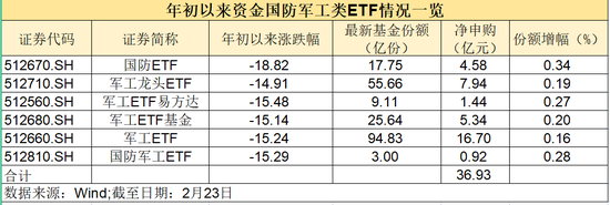 目前市面上军工类ETF合计6只,2022年以来份额出现不同程度增长。其中国防ETF份额增加34.48%,由去年末的13.2亿份增至2月23日的17.75亿份;国防军工ETF份额增加近3成;军工ETF易方达由7.15亿份增加至9.11亿份,增幅同样接近3成;军工ETF基金份额增加幅度接近20%,最新份额25.64亿份。军工ETF、军工龙头ETF份额均获16%以上的增长。