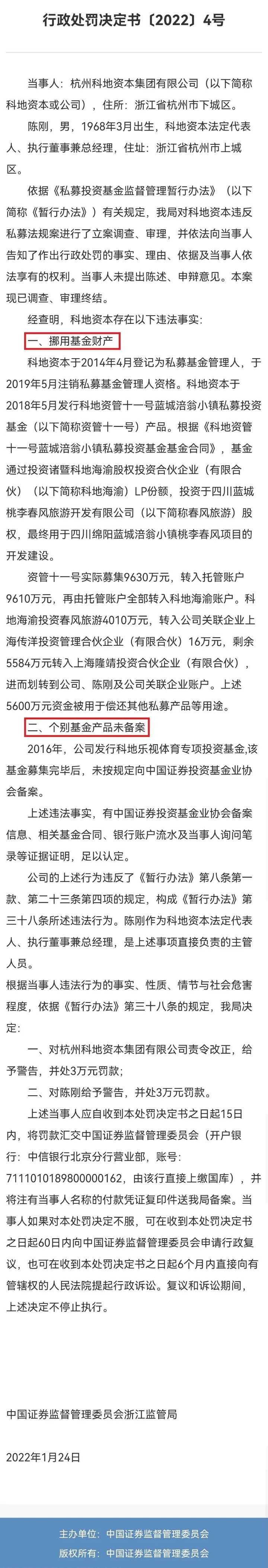 证监局决定对杭州科地资本集团有限公司责令改正,给予警告,并处3万元罚款,同时对科地资本法定代表人、执行董事兼总经理陈刚给予警告,并处3万元罚款。
