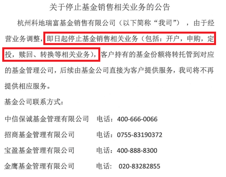 去年年末,杭州科地瑞富基金已在自己官网上挂出停止基金销售相关业务的公告。