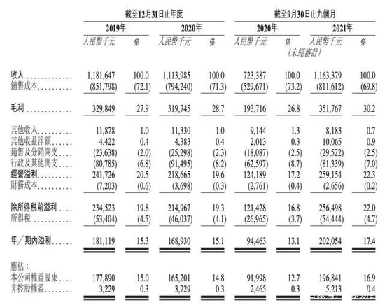 毛利率方面,2019年、2019年、2020年及2021年前三季度,杨国福的毛利率分别为27.9%、28.7%、30.2%,相对保持稳定。特别说明的是,杨国福2020年前三季度的毛利率则为26.8%,为期内最低值。