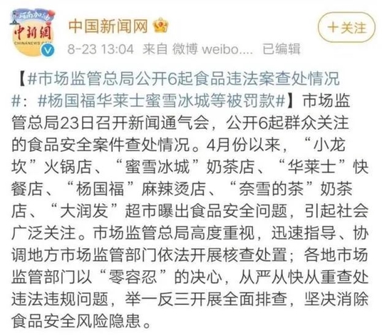而据官方通报,2021年7月24日,广东省市场监管部门获知深圳市杨国福麻辣烫店存在汤料污秽不洁等食品安全问题的线索后,立即对该门店进行现场检查,针对其违法违规行为,进行立案查处,并查封了涉事门店,没收违法所得,罚款5万元。
