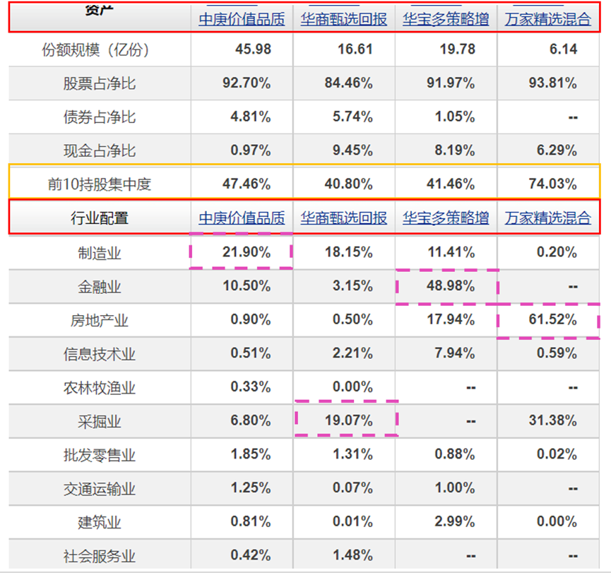 除万家精选的前十大持仓集中度在74%以上外(满仓地产+能源),剩下三只基金的前十大集中度都在50%以下,且行业也算是适度分散。