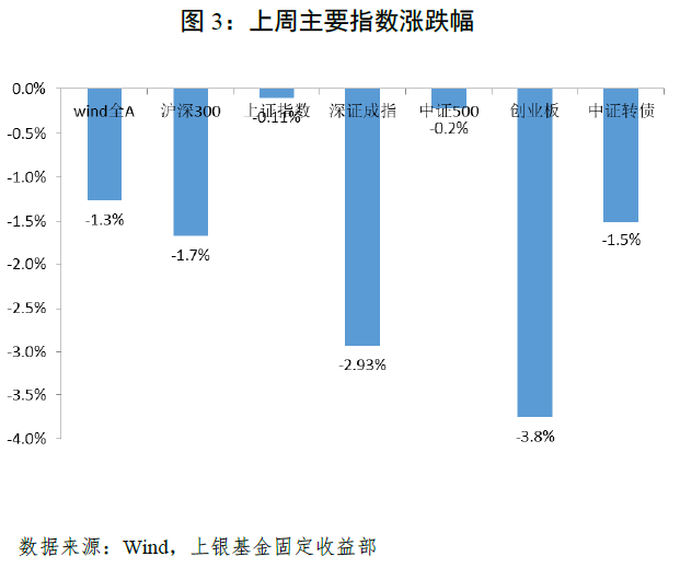 股票方面:上周股指整体下跌,上证指数下跌0.11%,深证成指下跌2.93%,创业板指下跌3.8%;行业板块方面,煤炭、农林牧渔以及交运等行业表现较优,上涨4%-10%,电气设备、汽车、家电等行业表现较弱,下跌3%-5%。