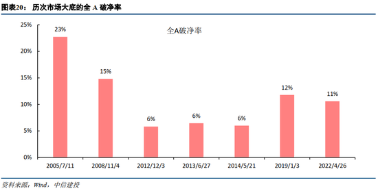 (2)破净率:破净率计算方法为股价跌破每股净资产公司数/上市公司总数,表示市场行情的好坏。历史底部行情伴随的破净率分别为:2005年7月11日→23%,2008年11月4日→15%,2013年6月27日→6%,2014年5月21日→6%,2019年1月3日→12%。本阶段底部该指标的值为11%,为2005年以来历史底部破净率平均水平。