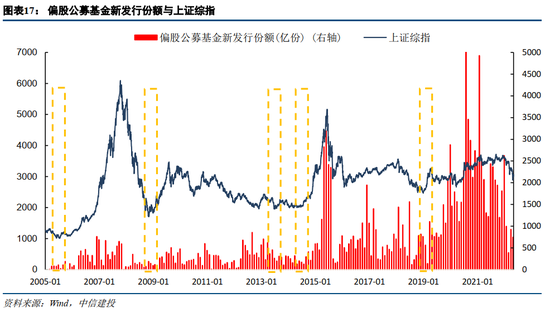 (1)每月权益类基金发行:我们选用公募基金的发行和偏股公募基金新发行份额作为权益类基金的代表,二者走势与市场走势保持一致,基本没有滞后性。目前的公募基金发行指标值为449.72,于4月底出现,为2019年以来历史分位数的12.5%,处于较低的水平;偏股公募基金新发行份额指标当前值为747.5,于4月底出现,为2015年以来历史分位数的44.9%,也处于一个较低的水平。