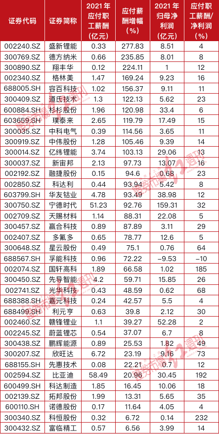 表3 锂电池企业2021年应付薪酬增幅(部分)
