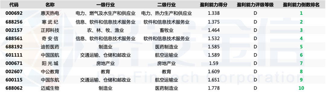 排在盈利能力预警榜前10名的公司分别为惠天热电、寒武纪、正邦科技、奇安信、迪哲医药、中国国航、阳光城、中公教育、中国东航、迈威生物,盈利能力均获得了“D”评级,盈利能力较差,经营风险较大。