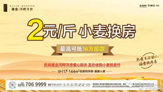 6月20日,两张地产项目海报窜红,一份出自河南商丘市民权县的建业河畔洋房,活动内容为“2元/斤,小麦换房”,最高可抵16万房款;另一份来自河南开封市杞县的建业城,“5元/斤,大蒜换房”。两份海报分别印有“爱心助农、高价收购小麦抵首付”、“爱心帮扶,助力安家”的字样。目前,小麦市场价在1.5元/斤上下,晾干的大蒜市场价约1.5元/斤。