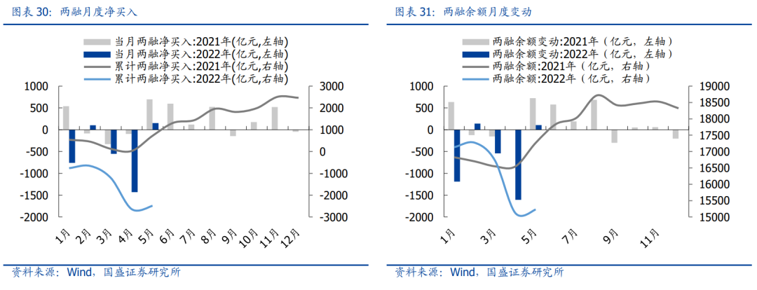 5月两融资金温和回流,单月净流入约152亿元,两融余额环比回升约106亿元。5月两融交易转为流入,合计净流入约152亿元。与此同时,两融余额在5月有所回升,环比抬升106亿元,两融余额升至1.52万亿,但仍明显低于21年同期。