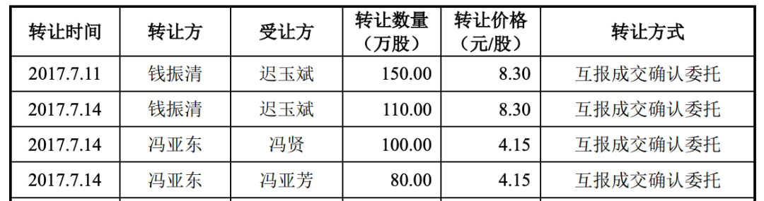 2017年7月,冯亚东将100万股股份转让给弟弟冯贤,又将80万股股份转让给妹妹冯亚芳。
