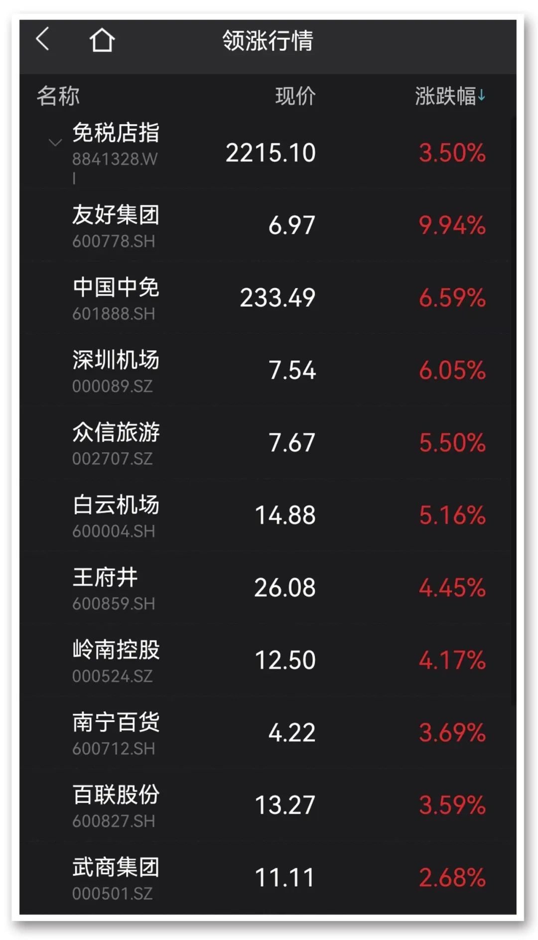 图片来源:Wind免税店板块半日涨3.50%,成分股中友好集团拉升封板,中国中免、深圳机场、众信旅游、白云机场、南宁百货等个股涨幅居前。