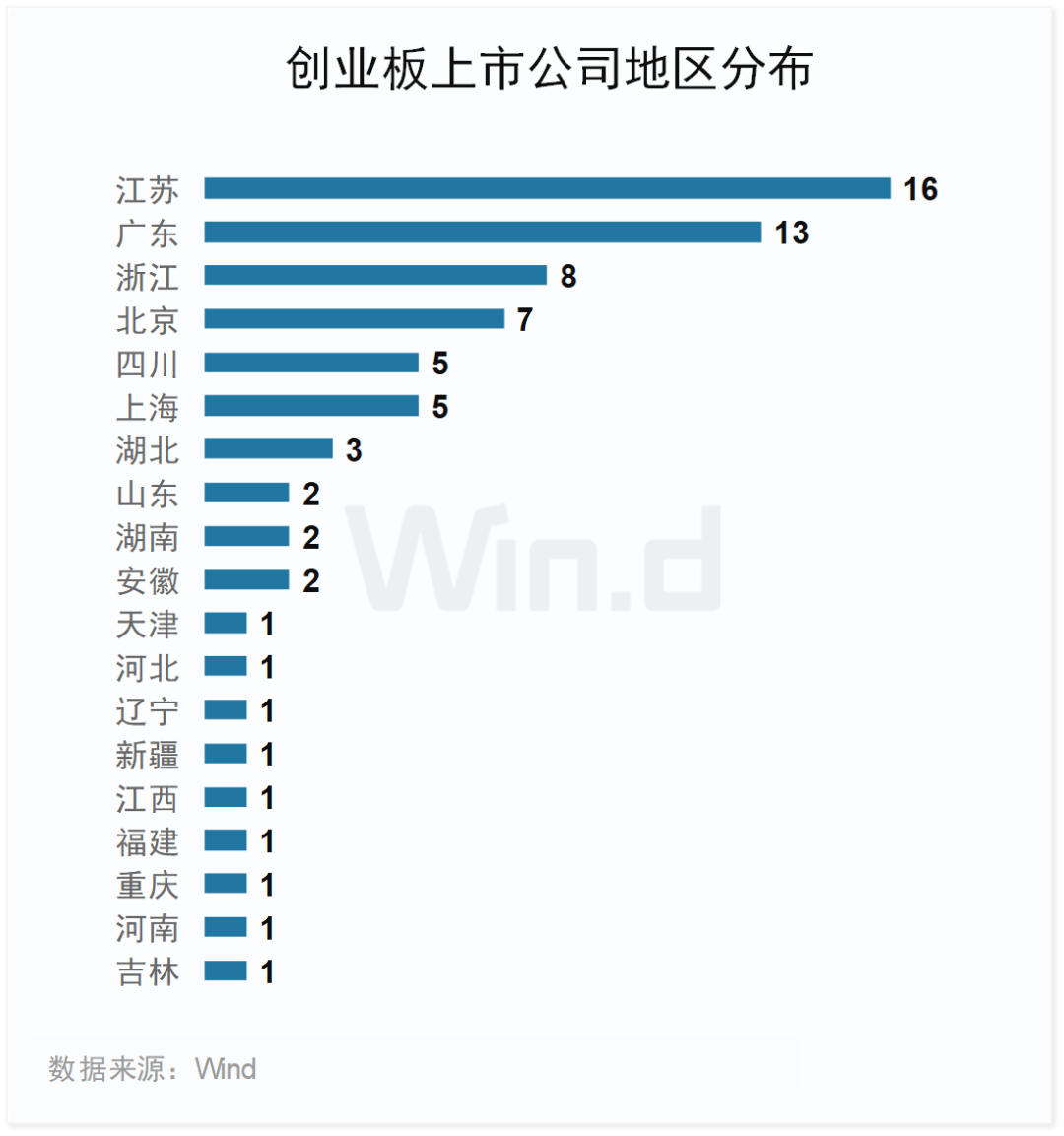 2022年上半年发行的创业板公司主要集中在江苏、广东,分别有16家、13家,浙江、北京分别有8家和7家,天津、河北等9个地区均仅有1家。