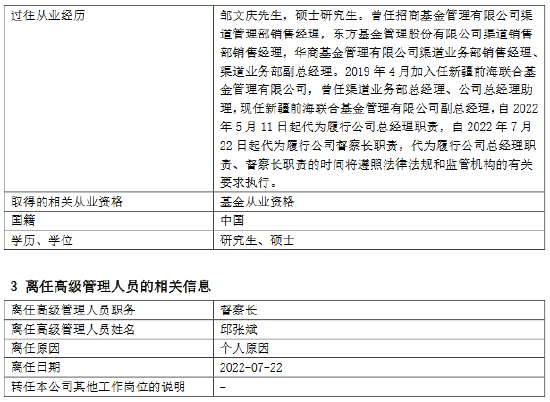 近日,前海联合基金发布高级管理人员变更公告,新任党刚为基金公司副总经理,任职日期2022-07-20。督察长邱张斌因个人原因离任,新任邹文庆为副总经理,代任督察长职务,任职日期2022-07-22。