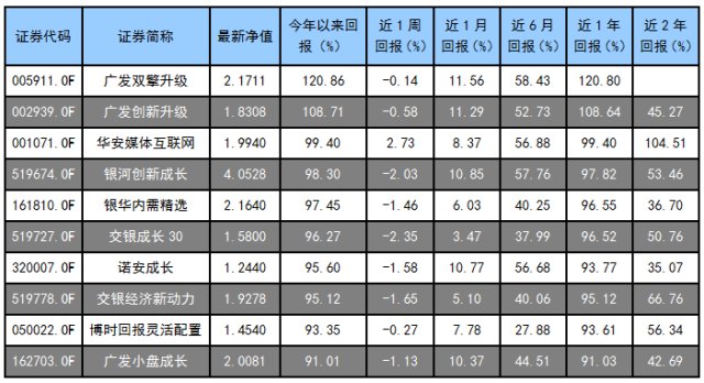 今年以来排名前10混合型基金平均涨幅99.61%。近一周,这10家混合型基金平均涨幅-0.85%,表现弱于各大指数,其中华安媒体互联网涨幅最大,达到2.73%。