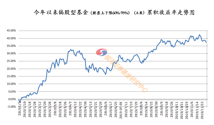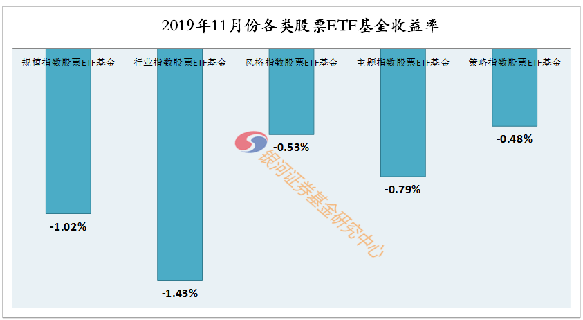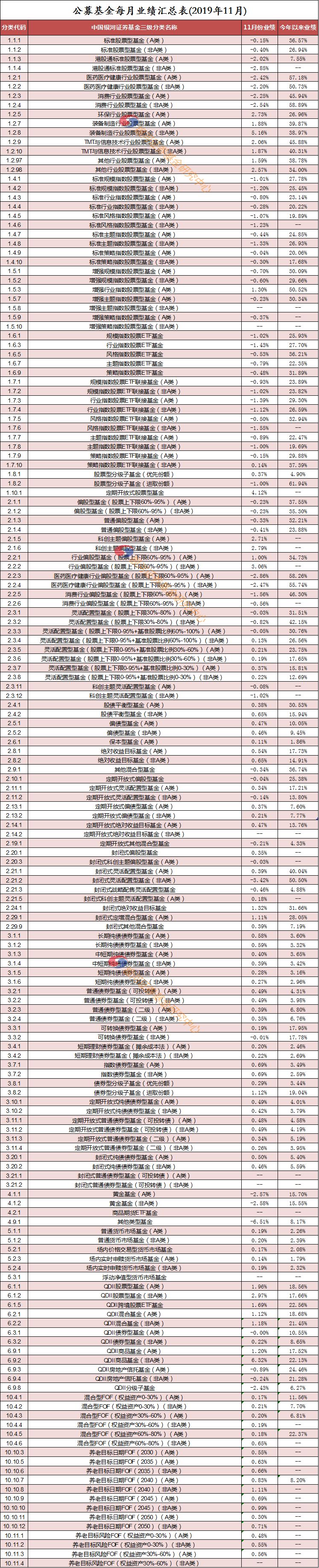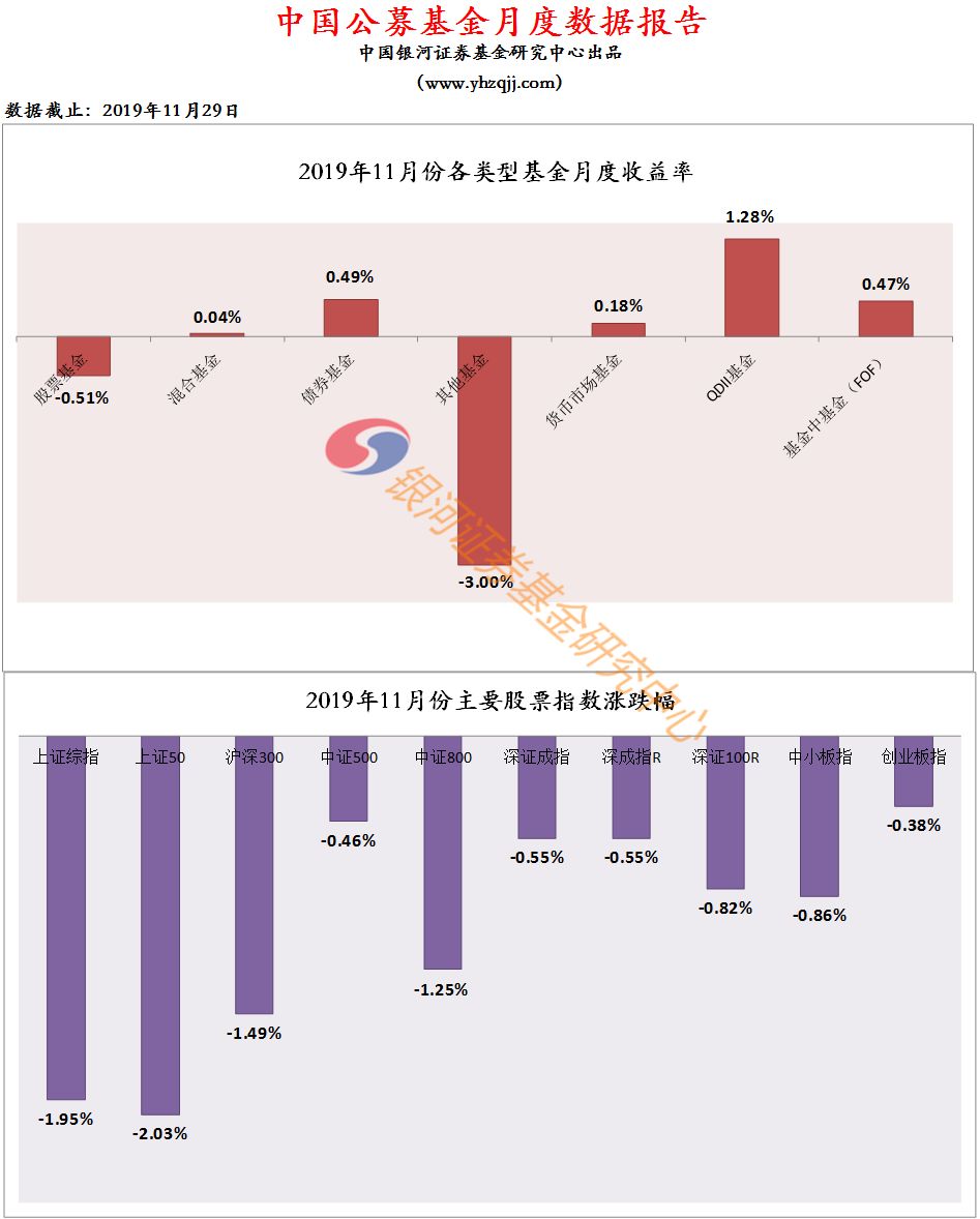 2019年11月份,根据银河证券一级分类,股票基金(含指数基金)下跌0.51%,混合基金上涨0.04%,债券基金上涨0.49%,货币市场基金上涨0.18%,QDII基金上涨1.28%,其他基金(黄金ETF)下跌-3%,基金中基金(FOF)上涨0.47%。2019年11月份,我们重点考察主要类型基金。由于主要类型基金特征鲜明、风格清晰,是具有指标与代表意义的基金类型。主要类型基金月度业绩如下:1.1.1标准股基-0.15%、2.1.1混合偏股基金-0.23%、3.1.1长期纯债基金0.58%、5.1.1货币市场基金0.19%。