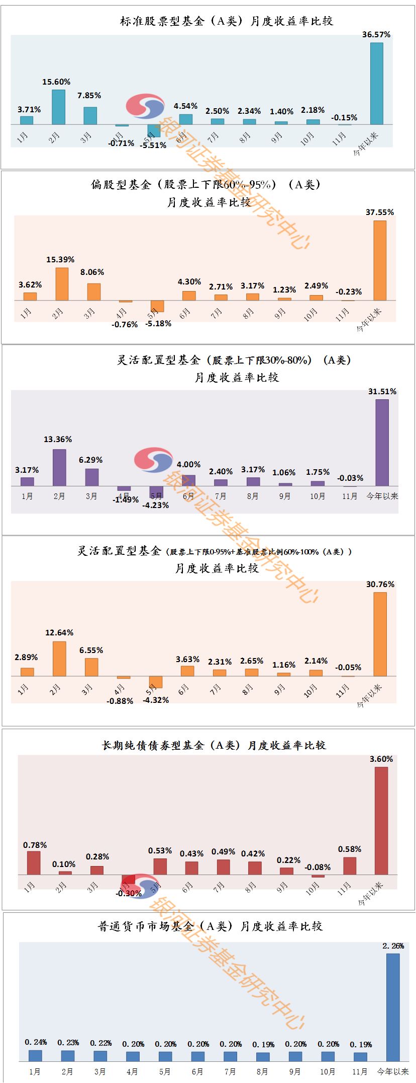 11月份主要类型基金月度业绩如下:1.1.1标准股基-0.15%、2.1.1混合偏股基金-0.23%、3.1.1长期纯债基金0.58%、4.1.1黄金基金-2.57%、5.1.1货币市场基金0.19%。
