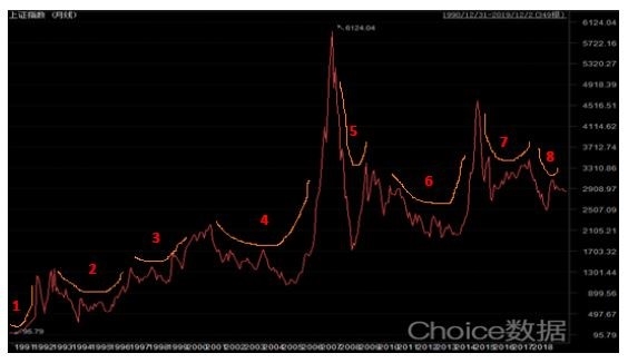 从上证指数历史走势图来看,呈现震荡缓慢上行的趋势,自成立以来大概有8次微笑曲线的周期。