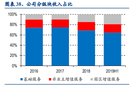 整体上分业务来看,2019H1,公司基础服务实现营收18.2亿元,同比增长42.7%,占比营收64.6%;非业主增值服务、园区增值服务分别实现营收4.6亿元、5.4亿元,分别同比增长35.3%,80.9%,分别占比营收16.3%、19.1%。