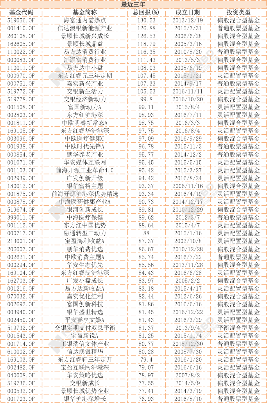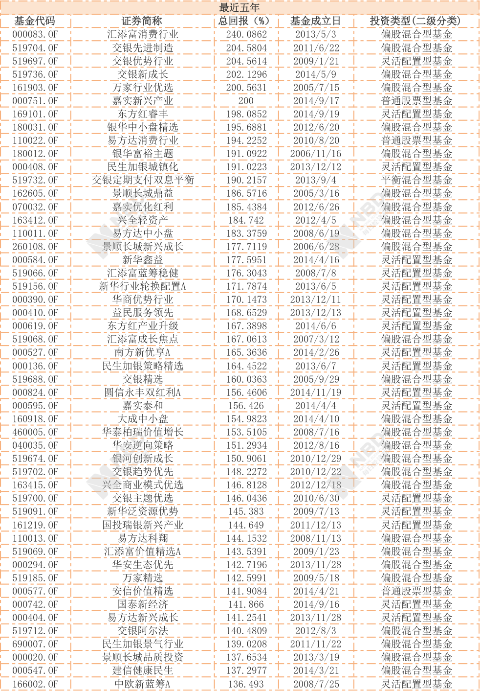 《每日经济新闻》记者根据相关数据统计梳理,列出一年期、三年期、五年期主动权益投资的前50强。