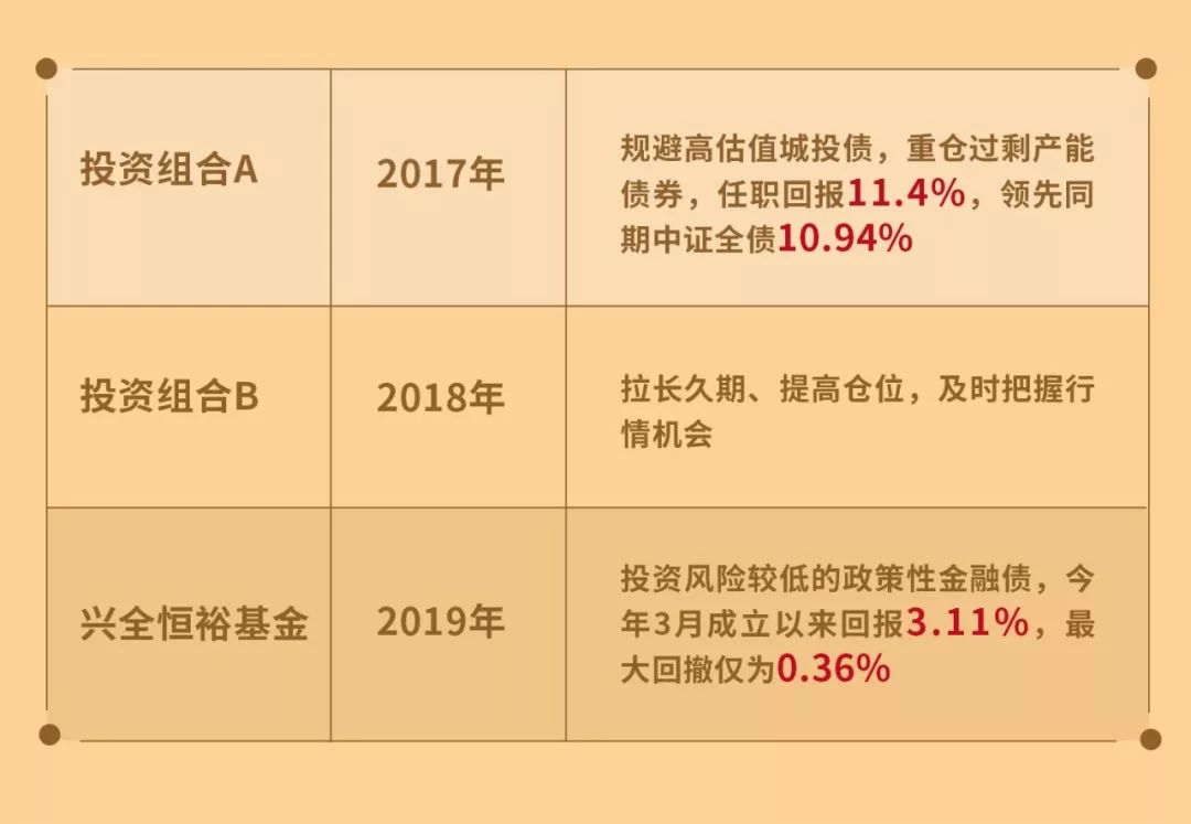 投资组合A运作时间为2017.2.10-2017.12.31,同期中证全债指数涨幅数据来源于Wind。兴全恒裕基金回报数据来自银河证券,2019.3.12-2019.12.30,业绩基准为中证全债指数,同期上涨3.75%。
