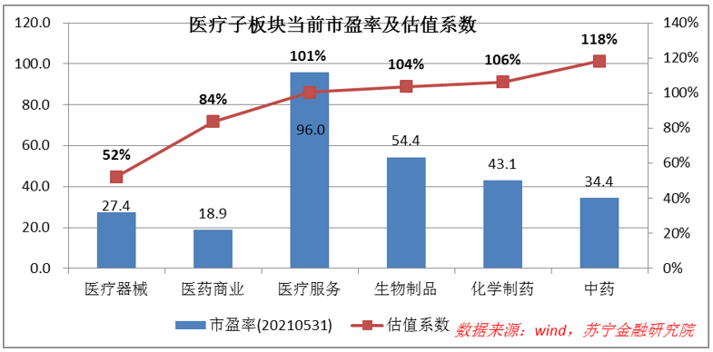 从盈利增长的角度看,医疗服务、医疗器械、生物制品子板块是首选,那当前各板块的估值水平如何呢?
