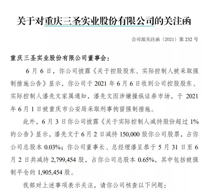6月6日晚间,三圣股份公告称,公司于2021年6月6日收到公司控股股东、实际控制人潘先文家属通知,潘先文因涉嫌操纵证券市场,于2021年6月1日被重庆市公安局采取刑事拘留强制措施。