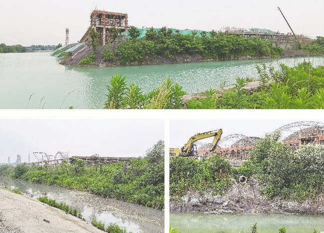 上图:磷石膏堆场东南角,被绿色防尘网遮盖的磷石膏;下左:淋溶水收集沟渠北段,水体颜色呈灰色;下右:通向淋溶水收集沟渠的水泥管及灰绿色的水体 每经记者 黄鑫磊 摄“石膏山”何时可消除?