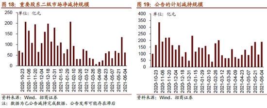 2021年6月市场解禁规模9056.6亿元,是近三年单月解禁规模最大值,其中本周解禁规模4705.9亿元,为解禁高峰。从解禁类型来看,本周解禁规模中,4474.8亿元首发原股东限售股解禁,占比超过95%;首发一般股份解禁2.1亿元,定增股份解禁22亿元和其他8亿元。