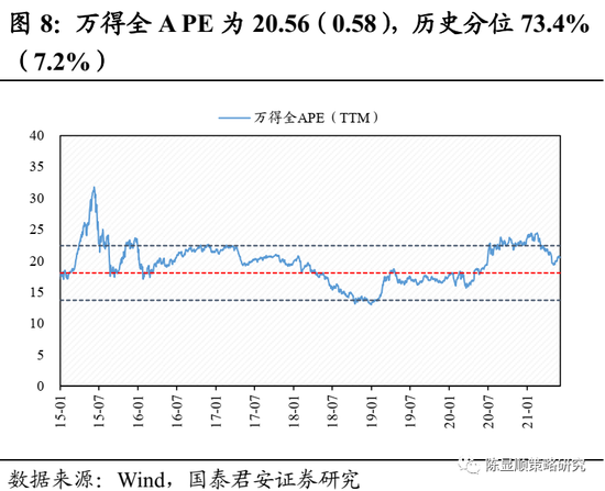 1)板块:各板块估值普涨,万得全A、创业板领涨。从PE历史分位变化来看,万得全A、创业板上行幅度分别为7.2%、5.1%。