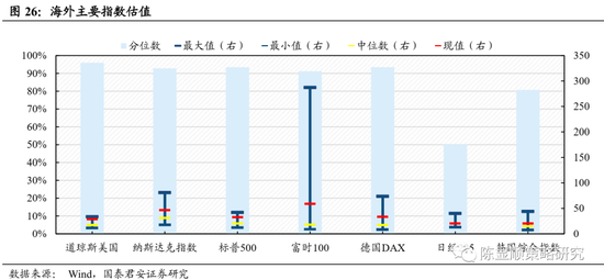 近两周海外各主要指数稳中有涨,其中日经225涨幅最大。日经225 PE分位数上行幅度达5.4%。富时100表现亦较优,上行幅度达2.4%。韩国综合PE上行1.8%。道琼斯美国、纳斯达克指数、标普500、德国DAX表现稳定,上行幅度较小。