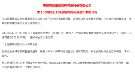 6月16日晚,药明康德公告,因信息披露违法违规,公司股东上海瀛翊投资中心(有限合伙)被证监会立案调查。