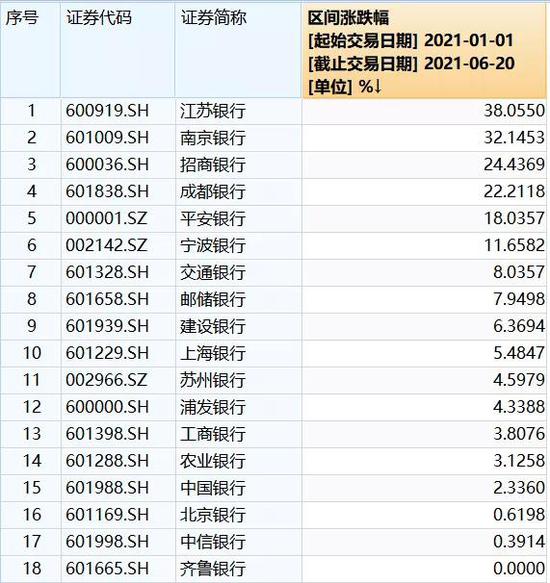 2021年以来银行股涨幅情况
