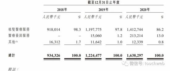 雍禾医疗收入主要分为植发医疗服务及医疗养固服务。雍禾医疗2020年来自植发医疗服务营收为14.13亿元,占比为86.2%;来自医疗养固服务收入为2.13亿元,占比为13%。