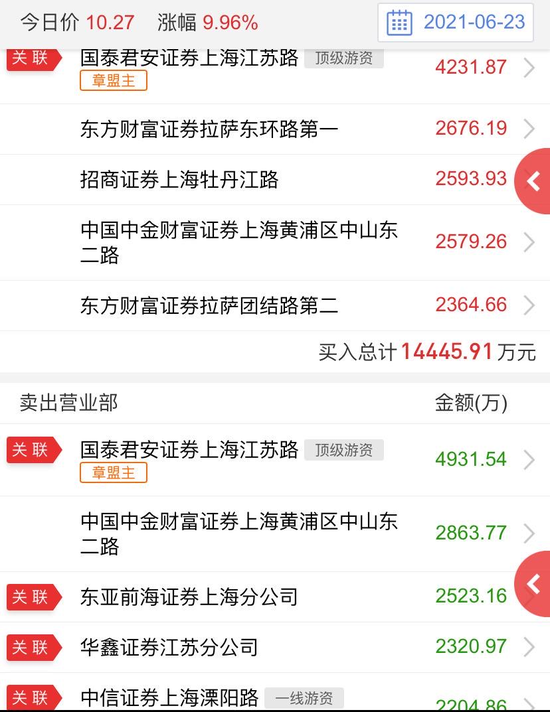 齐鲁银行6月23日盘后龙虎榜数据显示,6月21日-23日三个交易日内,疑似知名游资章建平常用席位——国泰君安证券上海江苏路买入齐鲁银行4231.87万元,同时卖出4931.54万元。