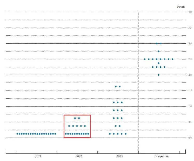 其中,横轴代表预测年份,如“2022”代表对2022年政策利率的预期;纵轴代表政策利率区间,每一区间宽度为25bp,如图2中2021年17个蓝点均在0-0.25之间,即6月17位委员均认为2021年政策利率区间保持在0-0.25%。