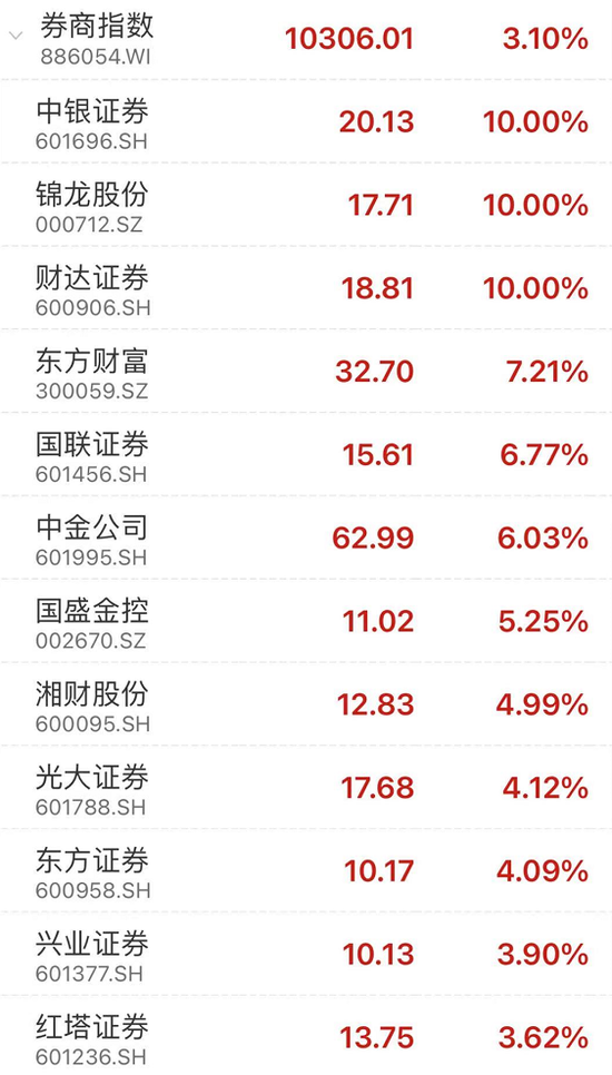 “牛市旗手”的券商板块异动,Wind券商指数大涨3.1%。中银证券、锦龙股份、财达证券3股涨停。