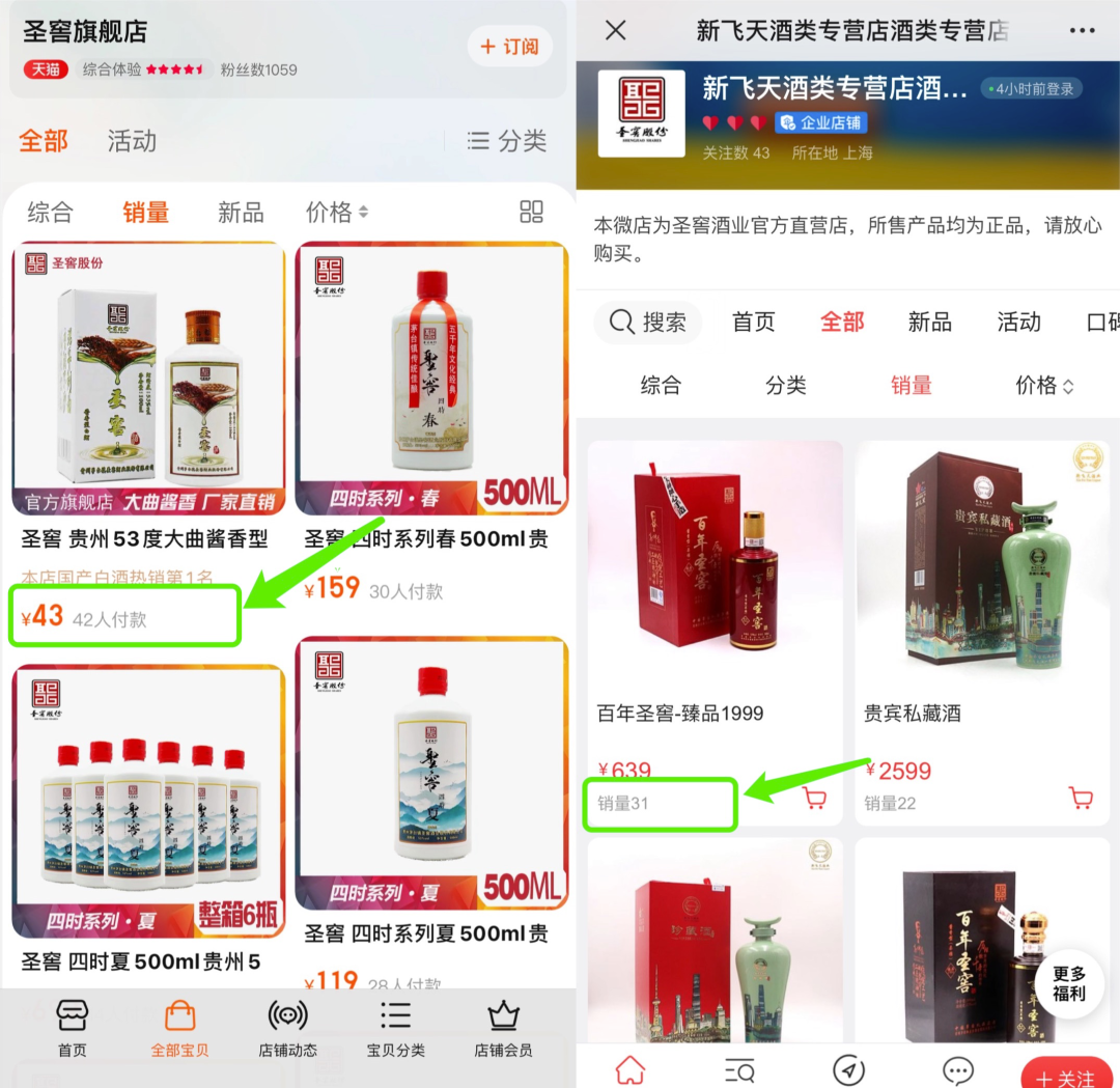 《红周刊》记者在酒仙网、好酒网等白酒经销网站查询“圣窖酒”,均无相关商品,而其天猫旗舰店内销量最多的单品近期仅42人付款,微店内单品销量最高仅为31件。让人不免好奇,圣窖酒业是否真的如其宣传的“获得了市场的广泛认可”?