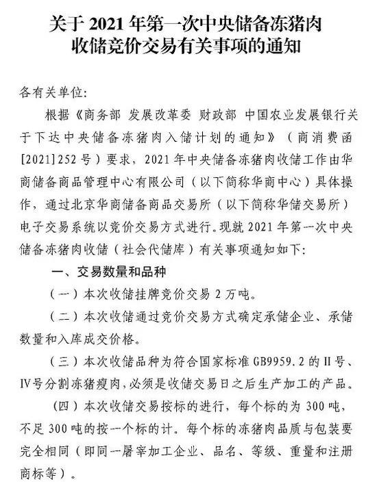 华储网也在7月4日公布了《关于2021年第一次中央储备冻猪肉收储竞价交易有关事项的通知》。根据《通知》,此次中央储备冻猪肉收储竞价交易量为2万吨。