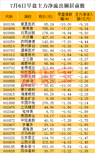 从资金面上看,早盘主力资金净流出最多的是复星医药,有9.16亿资金出逃。其次是爱美客,出逃资金6.34亿元。芯片龙头兆易创新、白酒龙头贵州茅台、中药龙头片仔癀、CRO龙头药明康德(维权)、牙科医疗龙头通策医疗等主力资金净流出额均超3亿元。