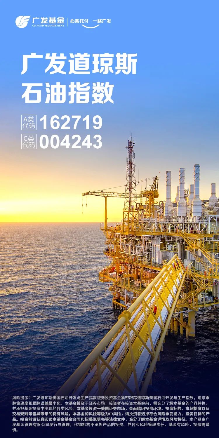 风险提示:基金的过往业绩并不预示其未来表现,基金管理人管理的其他基金过往业绩不代表新基金的未来表现。广发道琼斯美国石油开发与生产指数证券投资基金紧密跟踪道琼斯美国石油开发与生产指数,追求跟踪偏离度和跟踪误差最小化。本基金投资于证券市场,投资者在投资本基金前,需充分了解本基金的产品特性,并承担基金投资中出现的各类风险。本基金投资于美国证券市场,会面临因投资环境、投资标的、市场制度以及交易规则等差异带来的特有风险。本基金的风险等级为中风险,请投资者选择符合风险承受能力、投资目标的产品。投资前请认真阅读本基金基金合同和招募说明书等法律文件,充分了解本基金详情及风险特征。本产品由广发基金管理有限公司发行与管理,代销机构不承担产品的投资、兑付和风险管理责任。基金有风险,投资需谨慎。