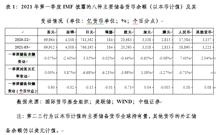 但鉴于第一季度美元指数出现了较多反弹,其他主要储备除英镑、加元外,对美元汇率均出现了不同程度的走弱,故当季美元储备份额的升幅仍居榜首,最大的输家是欧元,全球欧元储备持有量减少且份额下降0.71个百分点。同期,虽然全球日元储备持有量有所上升,但因当季日元汇率跌幅较大,日元储备的份额仍回落了0.15个百分点。当然,这没有改变美元储备份额为上世纪末以来次低的情形,且较去年一季度末回落2.26个百分点,无限量宽以来国际储备货币去美元化趋势初显(见表1、图5和图4)。