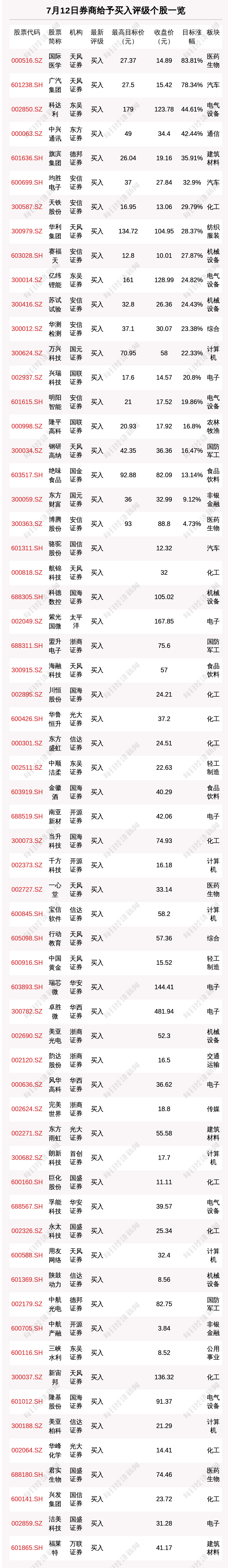 每经AI快讯,7月12日,券商给予评级的个股数共有75只,获得买入评级的个股数共有62只。在公布了目标价格的20只个股中,按照最新收盘价计算,预期涨幅排名居前的个股是国际医学(维权)(000516.SZ)、广汽集团(601238.SH)、科达利(002850.SZ),预期涨幅分别是83.81%、78.34%、44.61%。