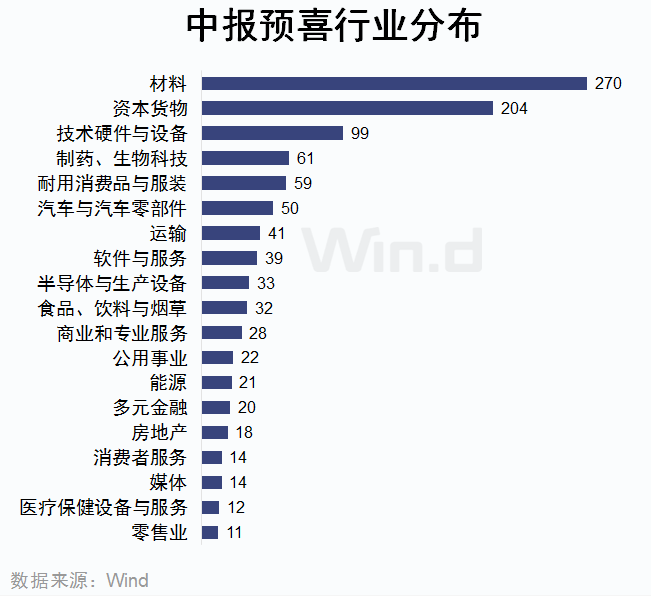 中报业绩预喜公司中,材料有270家,位列行业榜首;其次是资本货物,有204家;硬件设备、医药、服装、汽车等排名靠前。